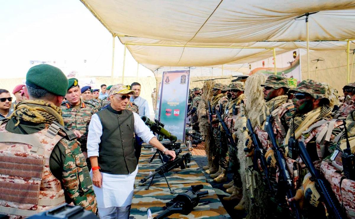 IMAGE: Rajnath Singh reviews a dynamic demonstration by the Bhairav Battalion and Ashni Platoon, showcasing next-gen combat vehicles, tanks and drone systems at Longewala. Photograph: @SpokespersonMoD X/ANI Photo