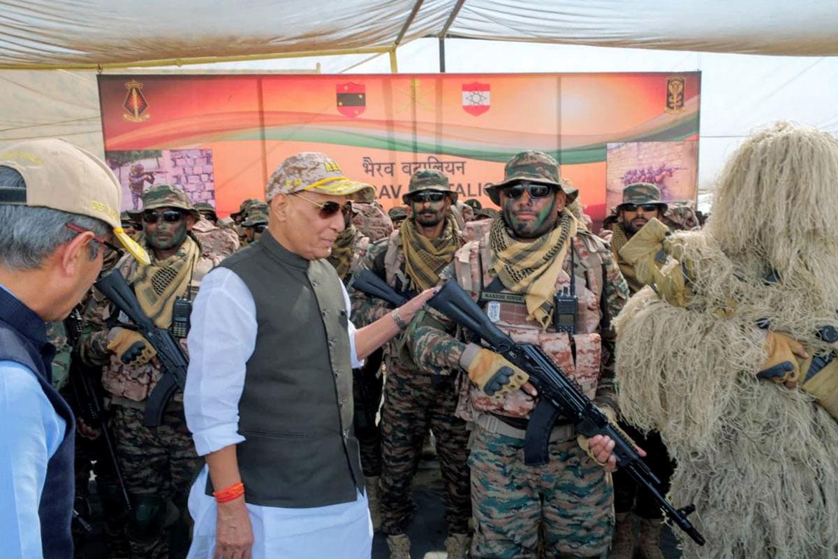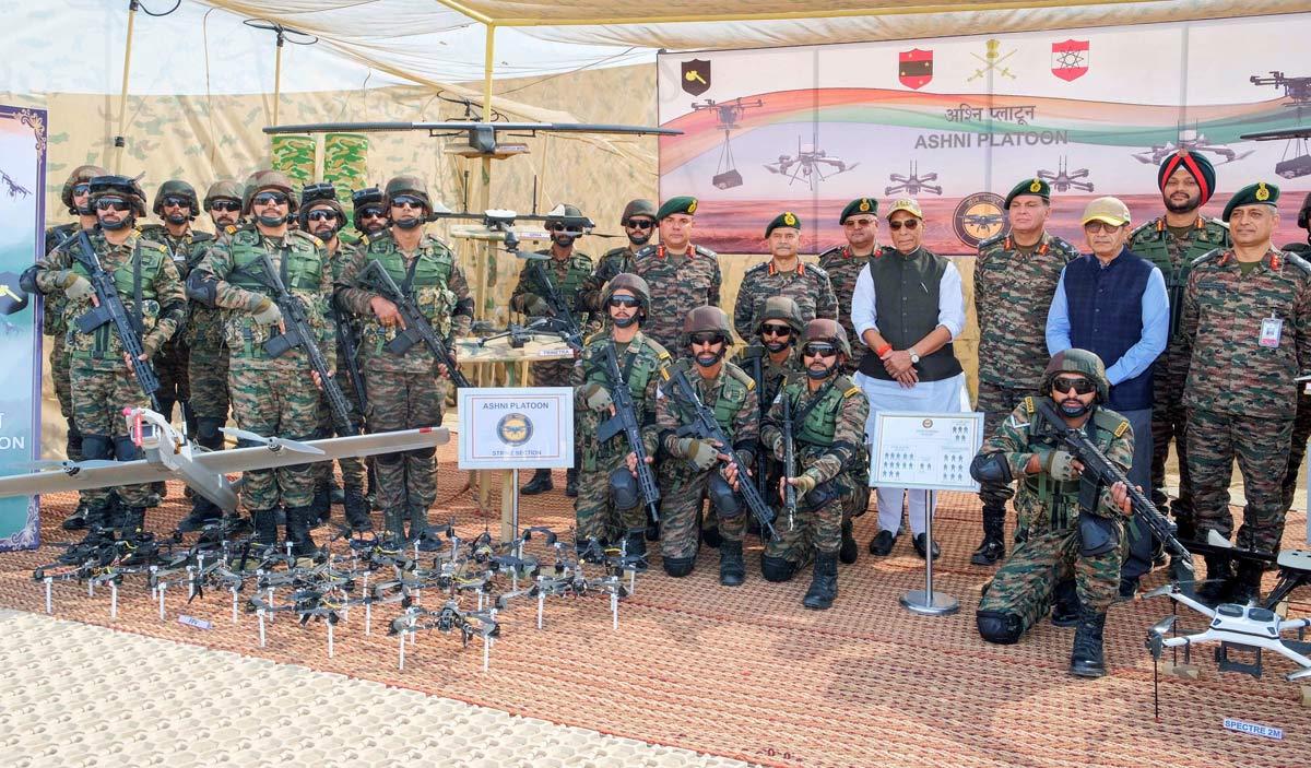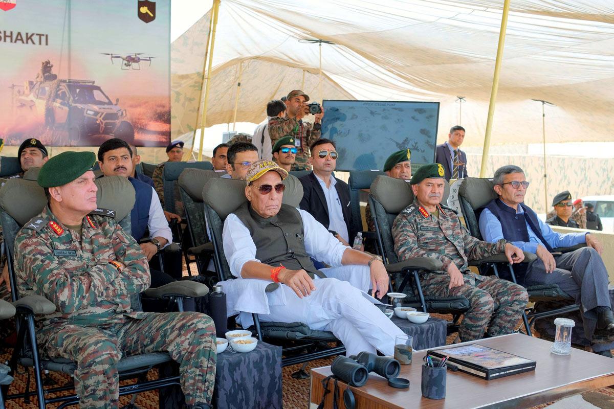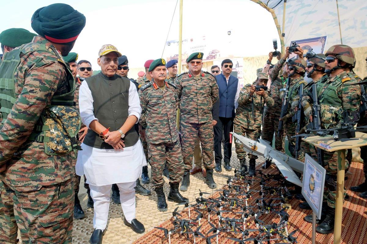 IMAGE: The defence minister observes the Ashni Platoon's live display of indigenous drone warfare systems, here and below. Photograph: @SpokespersonMoD X/ANI Photo