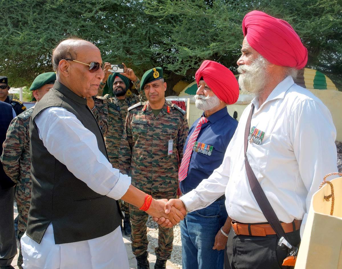 IMAGE: Rajnath Singh interacts with Indian Army veterans at Longewala. Photograph: PIB/ANI Photo