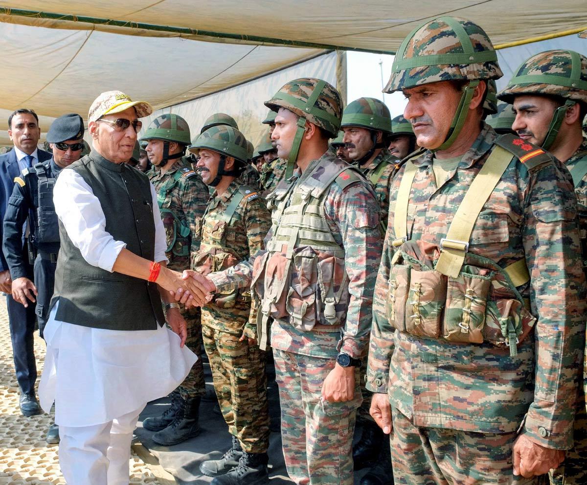 IMAGE: Rajnath Singh interacts with soldiers at Longewala, here and below. Photograph: PIB/ANI Photo