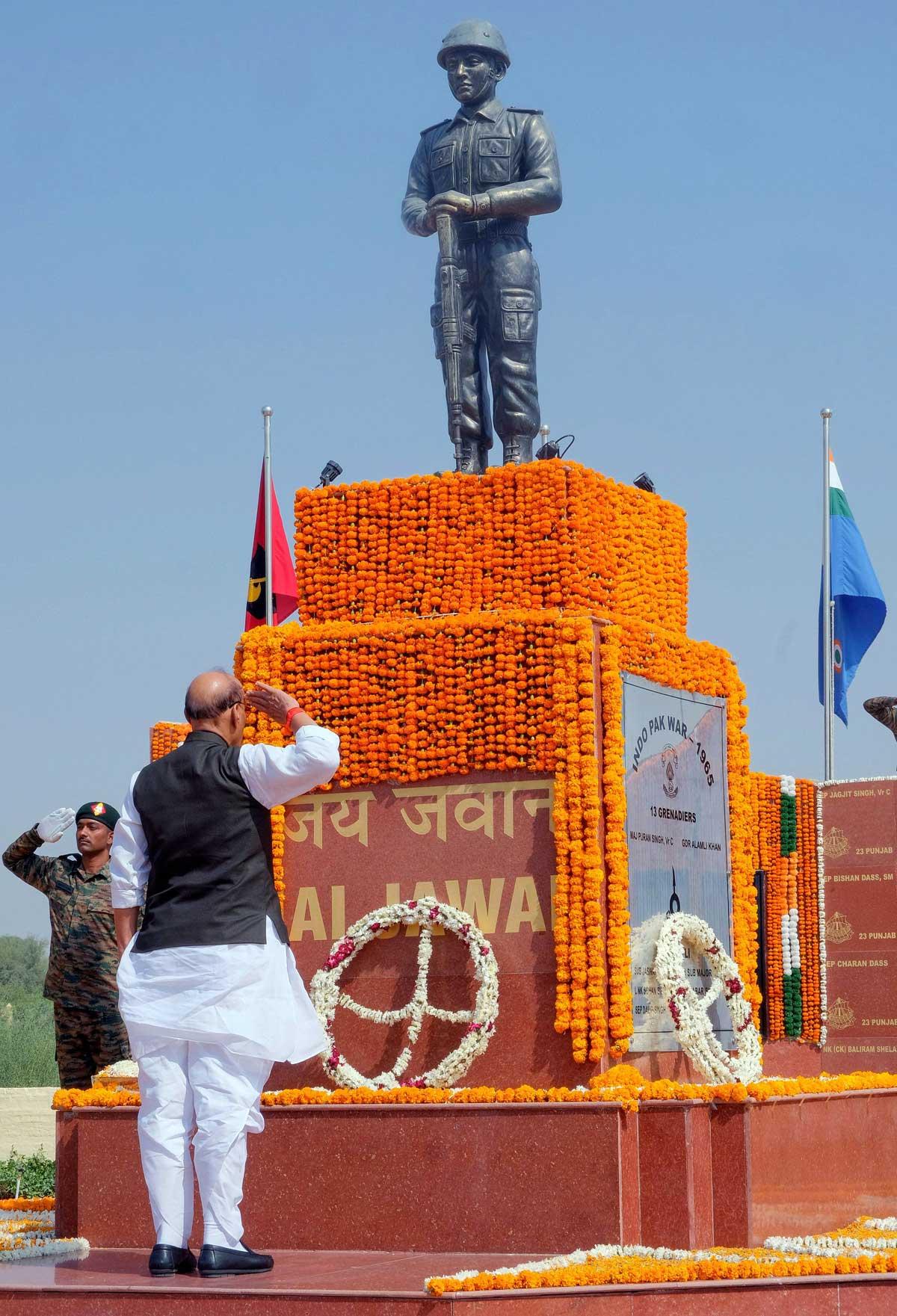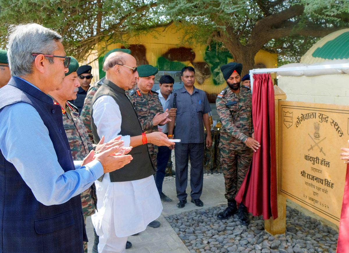 IMAGE: The defence minister pays homage at the Longewala War Memorial. Photograph: @SpokespersonMoD X/ANI Photo