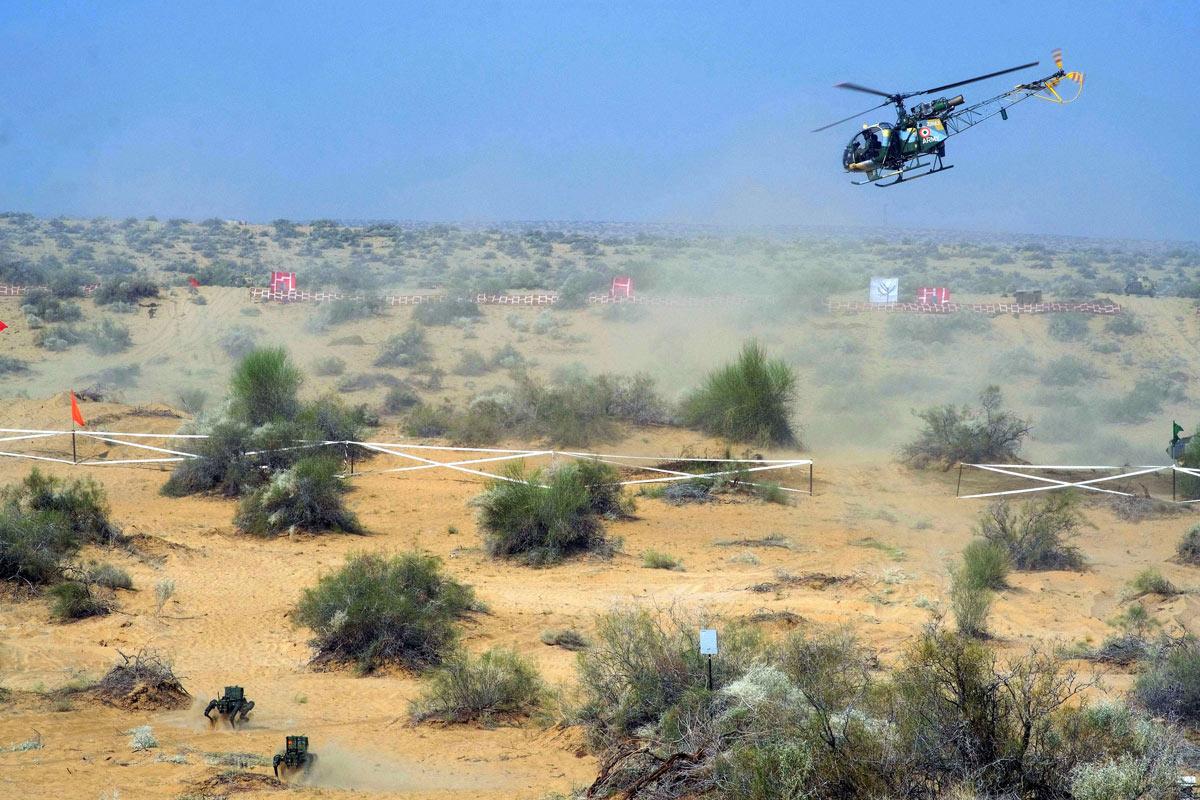 IMAGE: An Indian Army helicopter flies over the desert as robotic units advance. Photograph: @SpokespersonMoD X/ANI Photo