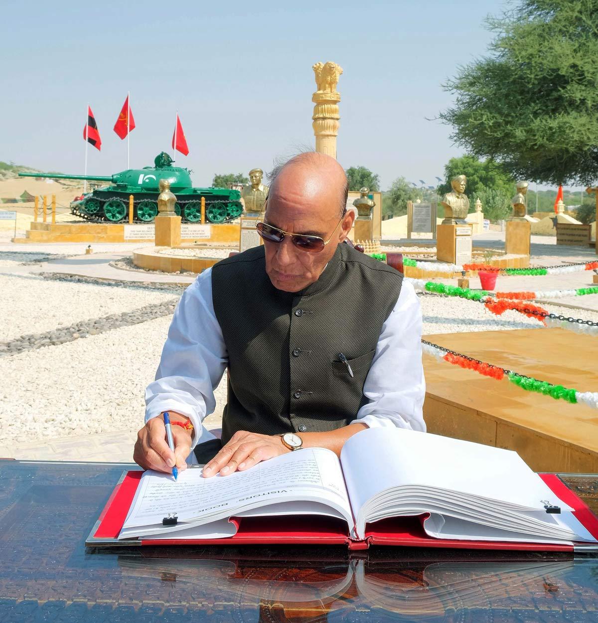 IMAGE: The Raksha Mantri writes a tribute message at the Longewala War Memorial. Photograph: @SpokespersonMoD X/ANI Photo