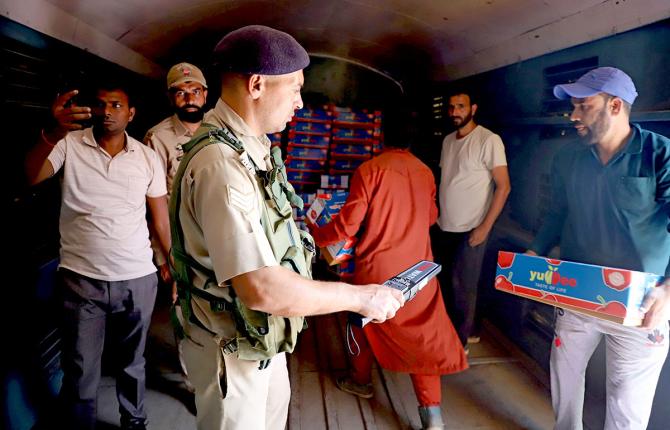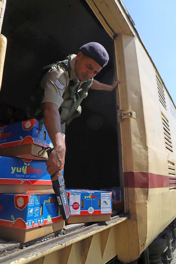 IMAGE: Security personnel checks the boxes of apples with a metal detector, here and below.