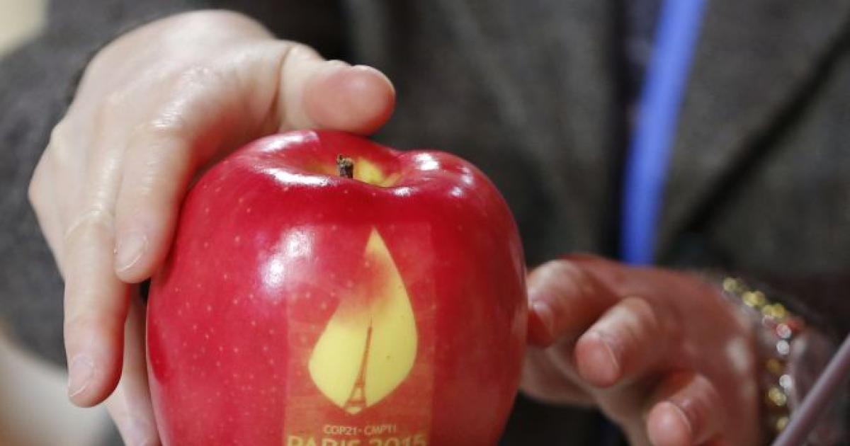 A participant holds an apple marked with the logo of the World Climate Change Conference 2015 during a meeting at Le Bourget, near Paris, France. Photograph: Stephane Mahe/ Reuters