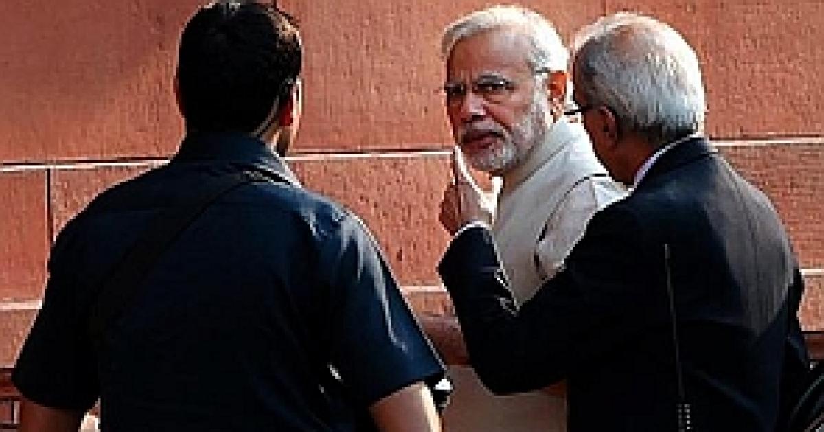 Image: Prime Minister Narendra Modi with principal secretary Nripendra Misra heads to chair the first Cabinet meet of his government in New Delhi. Photograph: PTI