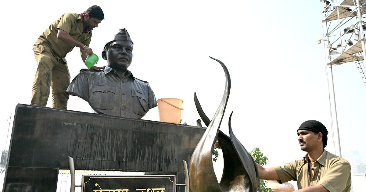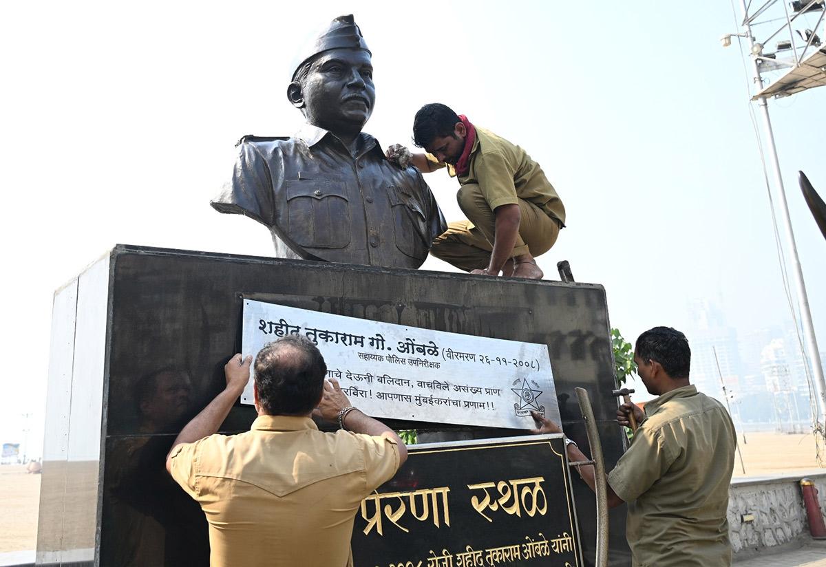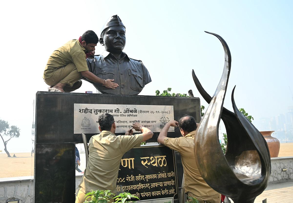 Ahead of the anniversary of the worst terrorist attack in Mumbai, BrihanMumbai Municipal Corporation workers clean the statue of Assistant Sub-Inspector Tukaram Omble, who captured terrorist Ajmal Kasab and ensured that Pakistan's diabolic role in the 26/11 attacks was exposed to the world.