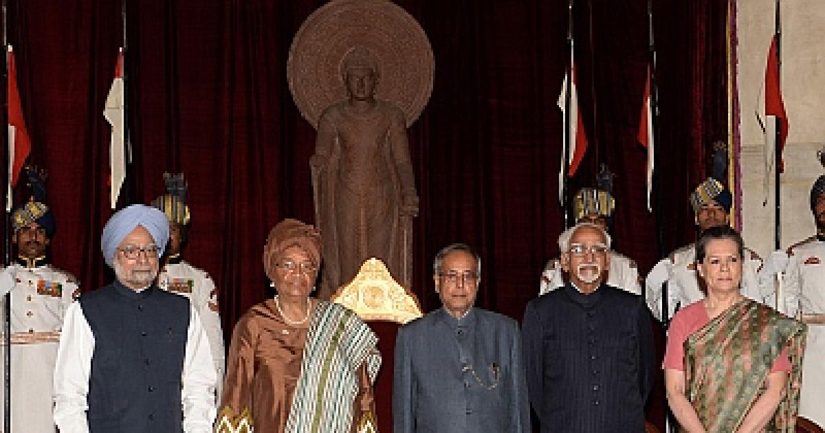 Image: President Pranab Mukherjee, Vice President Mohd Hamid Ansari, Prime Minister Dr Manmohan Singh and the National Advisory Council Chairperson Sonia Gandhi with the winner of Indira Gandhi Prize for Peace, Disarmament and Development, Ellen Johnson Sirleaf, the president of the Republic of Liberia, at Rashtrapati Bhavan, in New Delhi