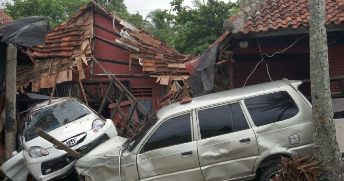 Damaged cars are seen among collapsed houses after a tsunami hit Banten, Indonesia. Photograph: Antara Foto/Dian Triyuli Handoko/Reuters
