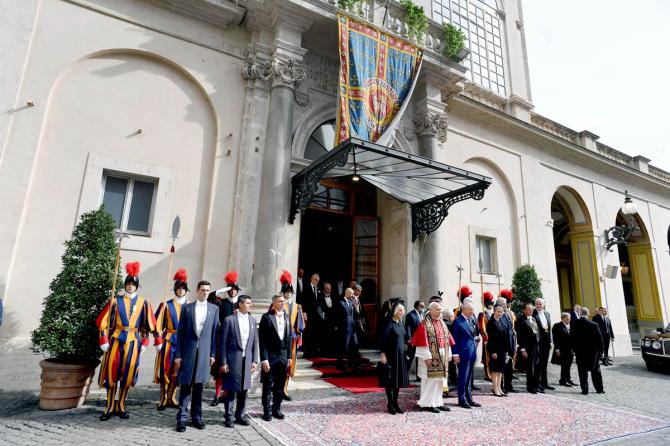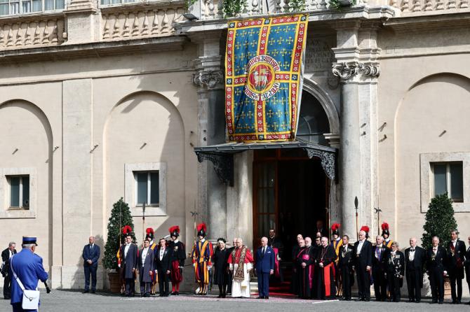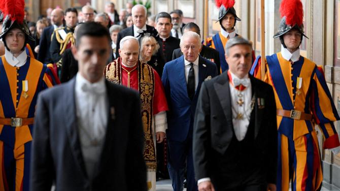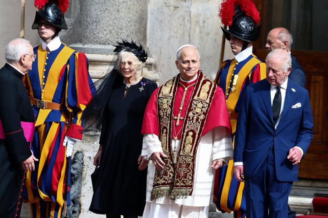 IMAGE: King Charles and Queen Camilla arrive to meet Pope Leo XIV at the Vatican. Photograph: Vatican Media/Handout via Reuters