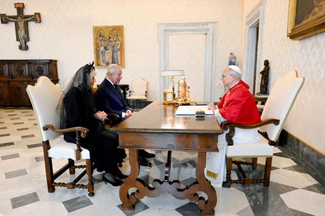 IMAGE: Pope Leo meets with King Charles and Queen Camilla during a private audience at the Vatican, here and below. Photograph: Vatican Media/Handout via Reuters