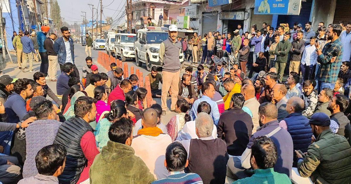 Hundreds gathered in the Drabshalla area of the district, burning tyres and blocking roads.