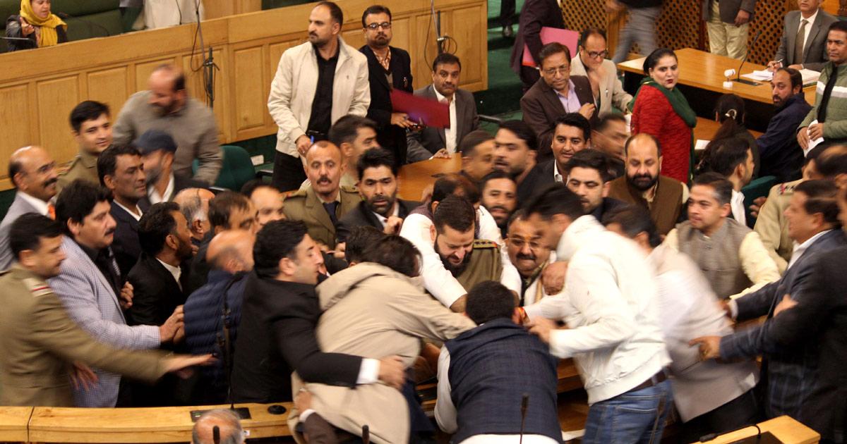 "Yesterday, some members came into the Well of the House and stood on the Chair of the secretary, legislative assembly. There is the national emblem on his chair and they stepped on the national emblem with their shoes on.
