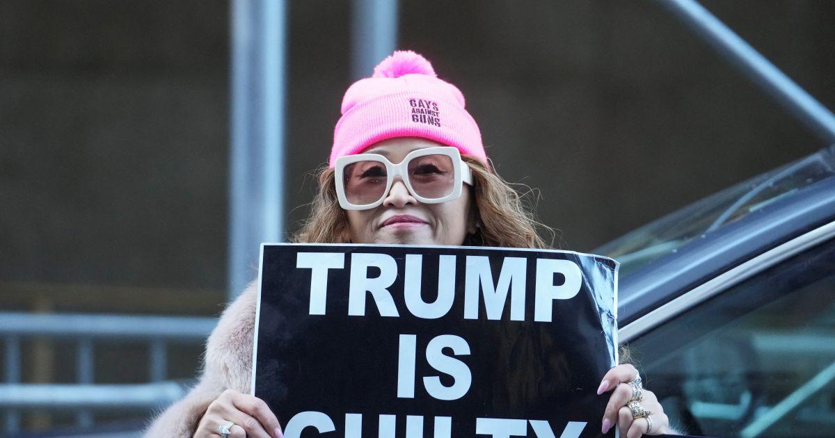IMAGE: An anti-Trump protester holds a sign outside Manhattan Criminal Court after former US President Donald Trump's indictment by a Manhattan grand jury following a probe into hush money paid to porn star Stormy Daniels, in New York City, on March 30, 2023. Photograph: Jeenah Moon/Reuters