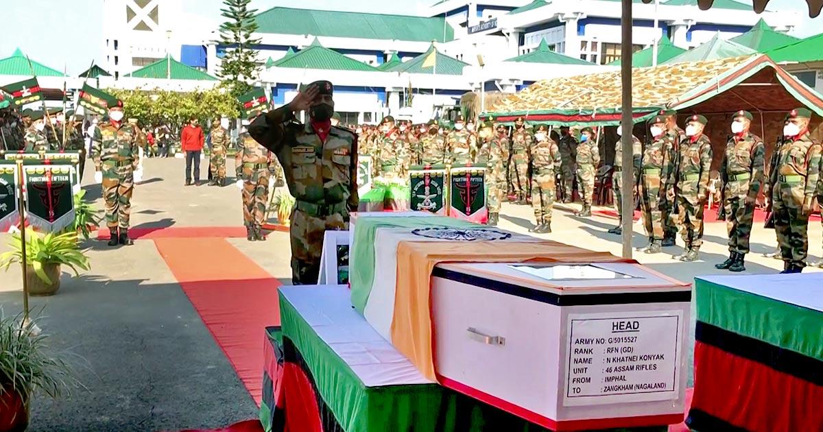 IMAGE: Assam Rifles personnel pay their last respects to Rifleman Khatnei Knoyak in Mon district on Sunday.