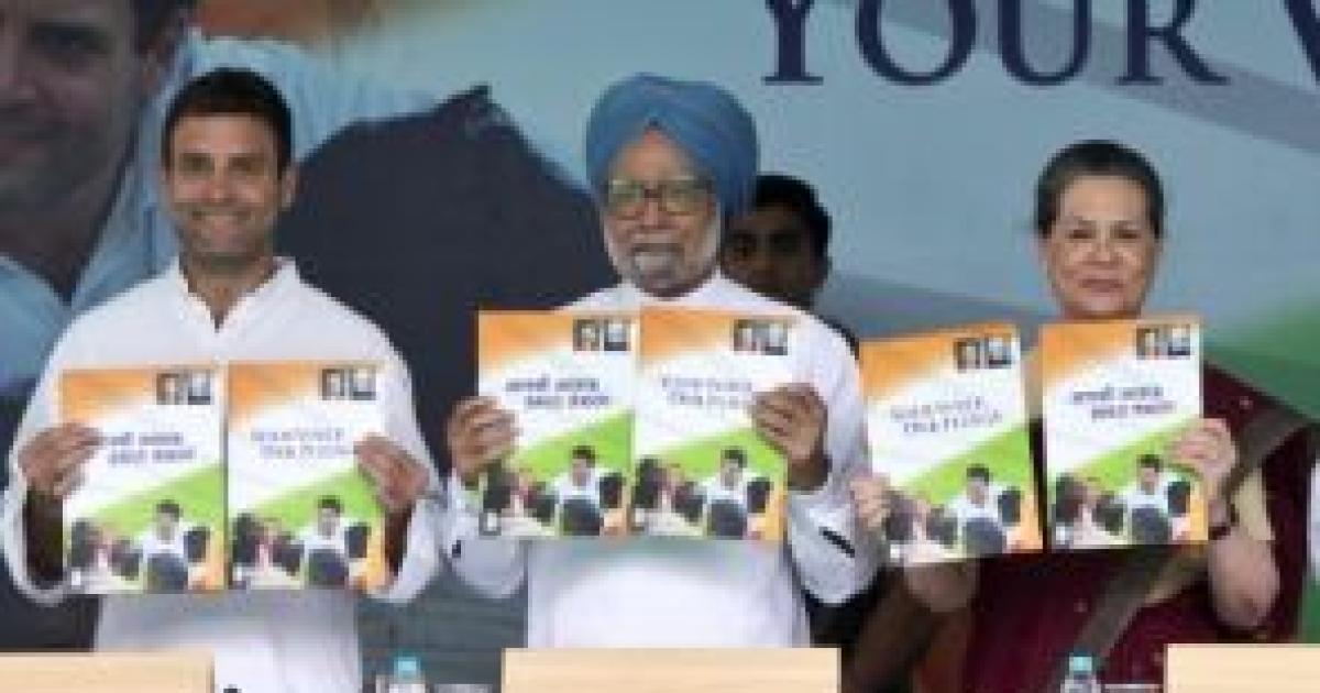Image: Prime Minister Manmohan Singh, Congress president Sonia Gandhi and vice president Rahul Gandhi present the party's manifesto in New Delhi. Photo courtesy: INC website