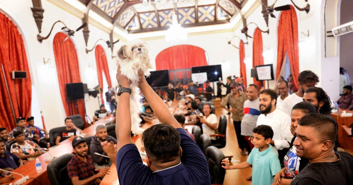 IMAGE: A demonstrator shows a dog as Sri Lanka's new 'Wildlife Minister' in President Gotabaya's cabinet meeting room.