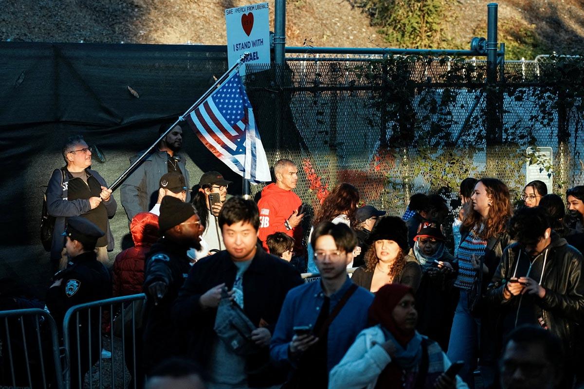 IMAGE: People protest against Mamdani as his supporters arrive at the rally. Photograph: Eduardo Munoz/Reuters