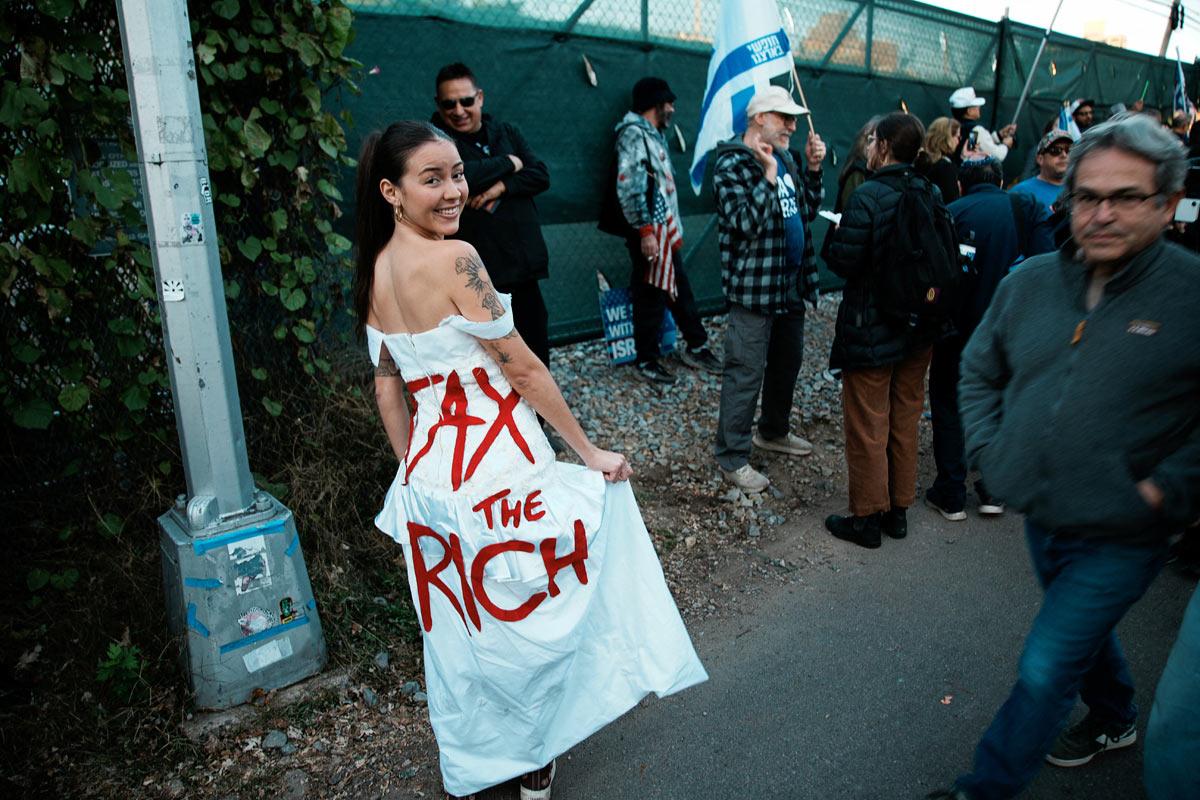 IMAGE: A woman wears a dress with the slogan 'Tax the Rich' outside the rally. Photograph: Eduardo Munoz/Reuters