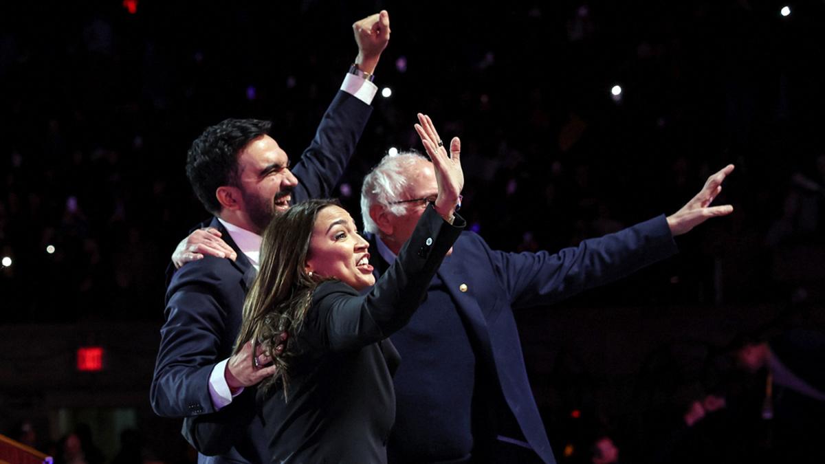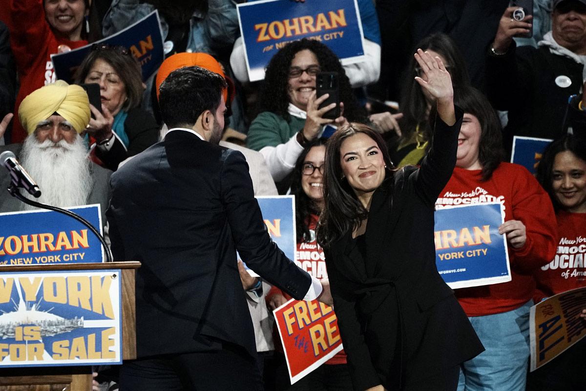 IMAGE: Ocasio-Cortez waves next to Mamdani. Photograph: Eduardo Munoz/Reuters