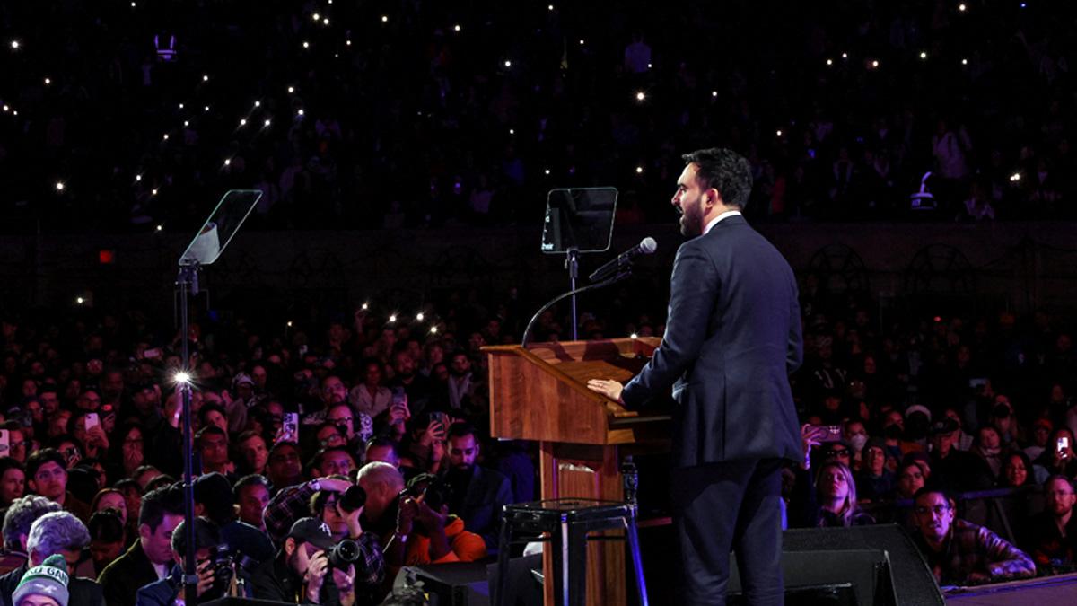IMAGE: Mamdani speaks at the rally, here and below. Photograph: Eduardo Munoz/Reuters
