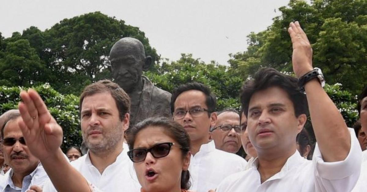 IMAGE: Congress Vice President Rahul Gandhi with party MPs Sushmita Dev, Gaurav Gogoi, Jyotiraditya Scindia and other party leaders in front of the Mahatma Gandhi statue protests against the suspension of six Congress MPs from Lok Sabha. Photograph: Vijay Verma/PTI Photo