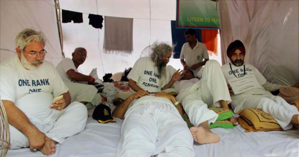 Image: Ex-servicemen on fast-unto-death over the One Rank One Pension issue, at Jantar Mantar in New Delhi on Thursday. Photograph: PTI