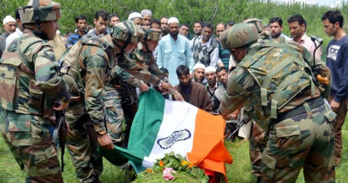 IMAGE: Army personnel pay tribute to slain army officer Lieutenant Ummer Fayyaz during his funeral at his native village Sudsona in Kulgam district. Photograph: PTI Photo