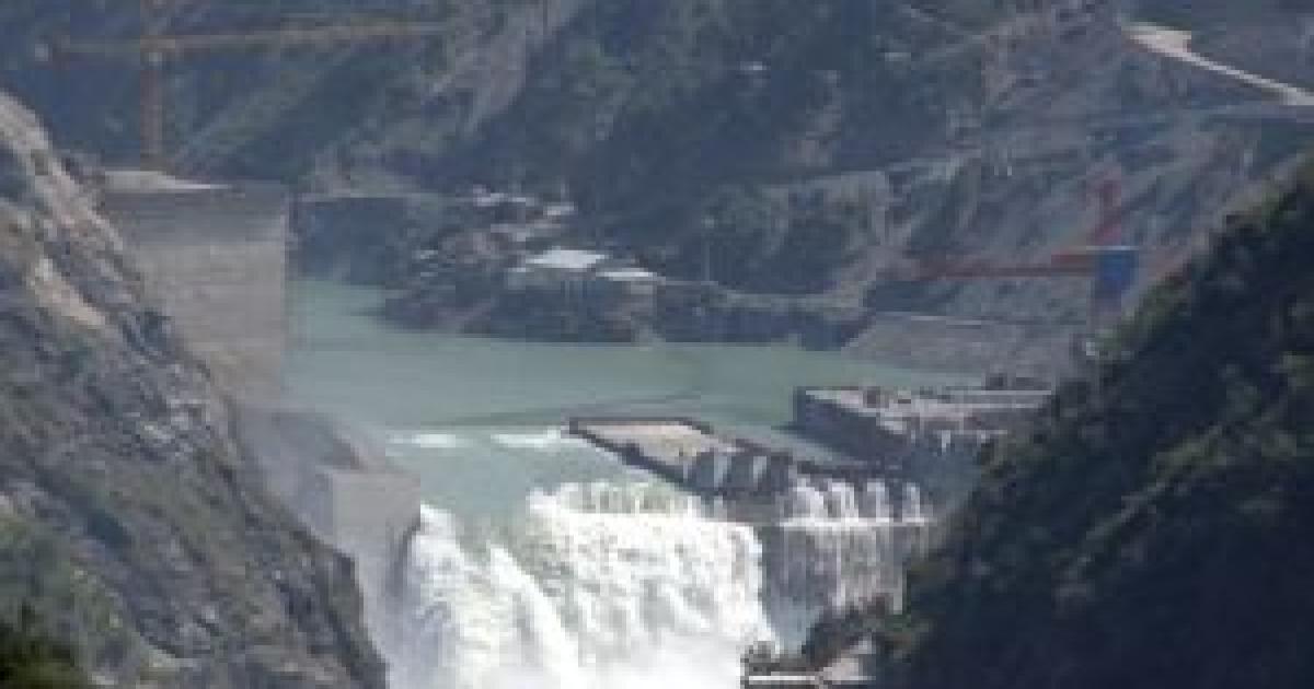 Image: Water flows on the banks of Chenab River with the Baglihar hydroelectric project in the background
