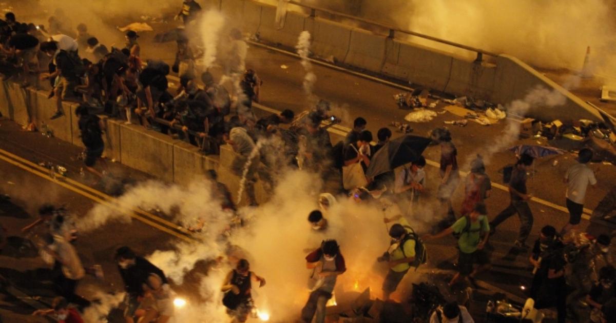 Riot police fire teargas to disperse protesters after thousands of demonstrators blocked the main street to the financial Central district outside the government headquarters in Hong Kong. Photograph: Stringer/Reuters