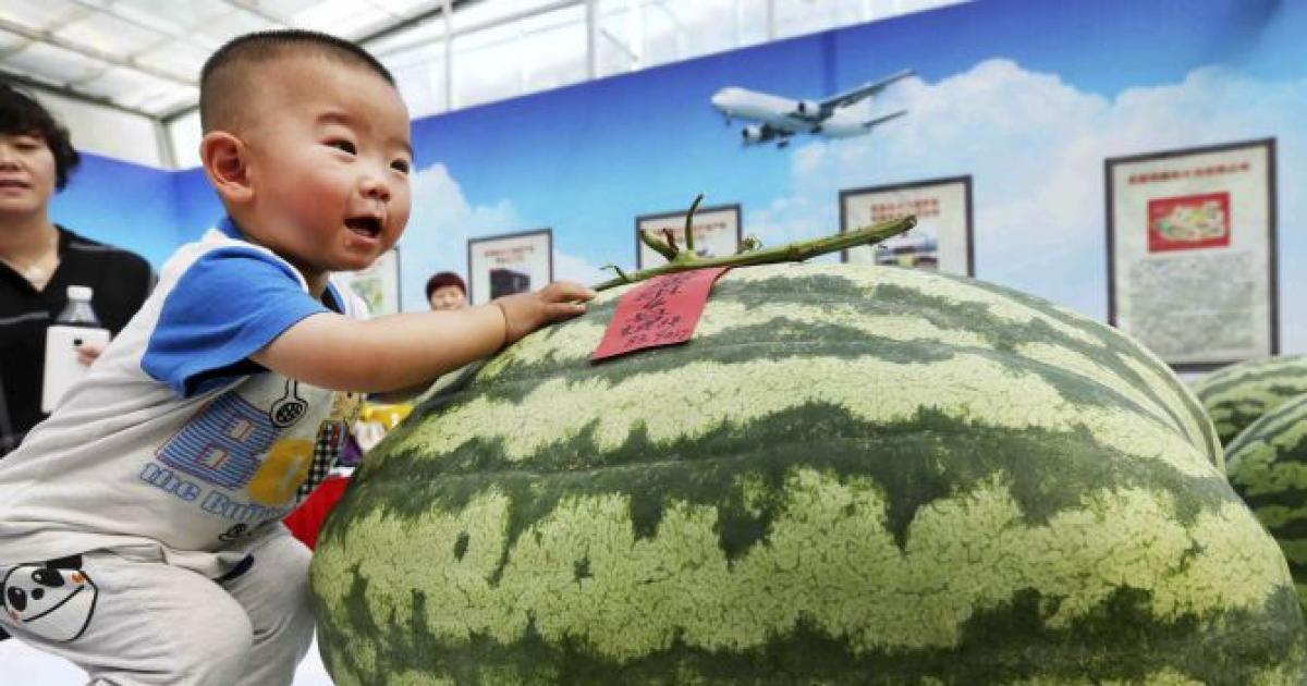 A child touches the biggest watermelon on display during an annual watermelon festival in Daxing district in Beijing, China. The biggest watermelon on the festival weighs about 84 kilogram, local media reported. Photograph: China Daily/Reuters