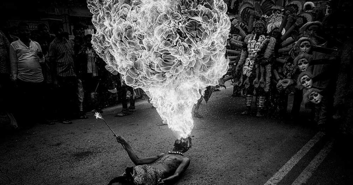 Untitled: A street drama performing by a local young boy. People are enjoying watching him pour flammable liquids inside his mouth and setting fire it during the performance.