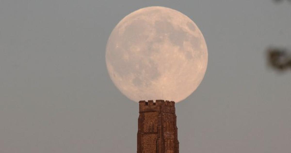 The moon rises over people gathered on Glastonbury Tor ahead in Somerset, England. Photograph: Matt Cardy/Getty Images