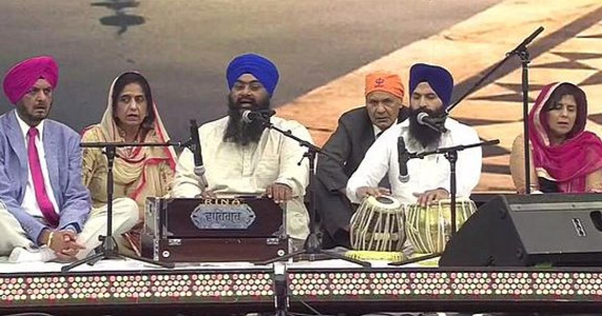 Kirtan singers of the Guru Nanak Society of Greater Cincinnati at the Howdy Modi event. They left everyone in the stadium spell bound with their soulful voices. Photograph: ANI/Twitter