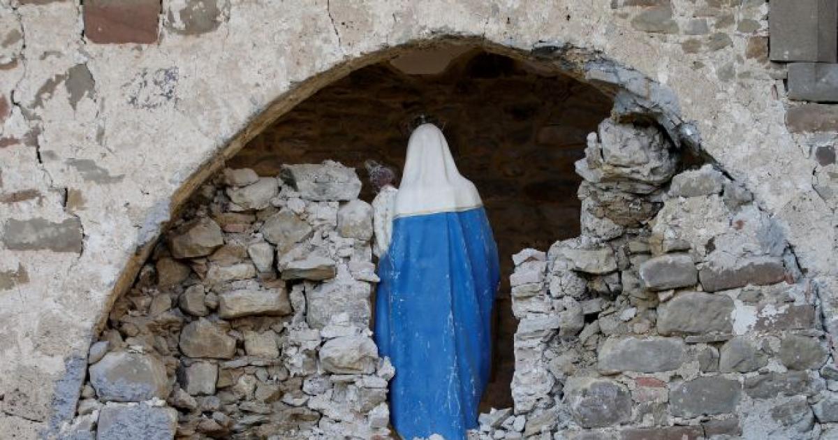 A damaged Virgin Mary statue is seen in a church following an earthquake at Cossito near Amatrice.