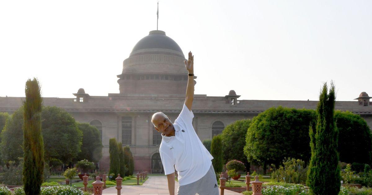 President Ram Nath Kovind performs yoga on the lawns of Rashtrapati Bhavan. Photograph: @rashtrapatibhvn/Twitter