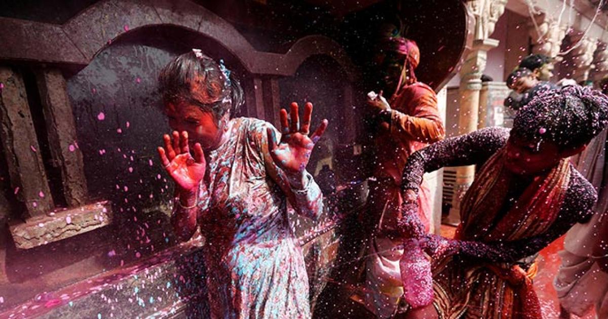Women daubed in colours hold an idol of Hindu goddess Radha as they take part in "Lathmar Holi" celebrations at a temple in UP town of Barsana. Photograph: Altaf Hussain/Reuters