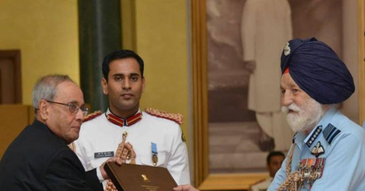 President Pranab Mukherjee felicitates Marshal of the Air Force Arjan Singh, Distinguished Flying Cross. The 96-year-old war veteran was honoured for displaying successful leadership and immense capability. Photograph: PresidentofIndiaRB/Facebook