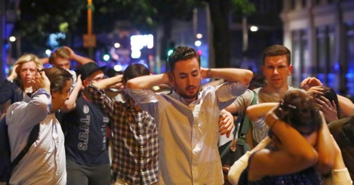 IMage: People leave the area with their hands up after the terror attack near London Bridge. Photograph: Neil Hall/Reuters