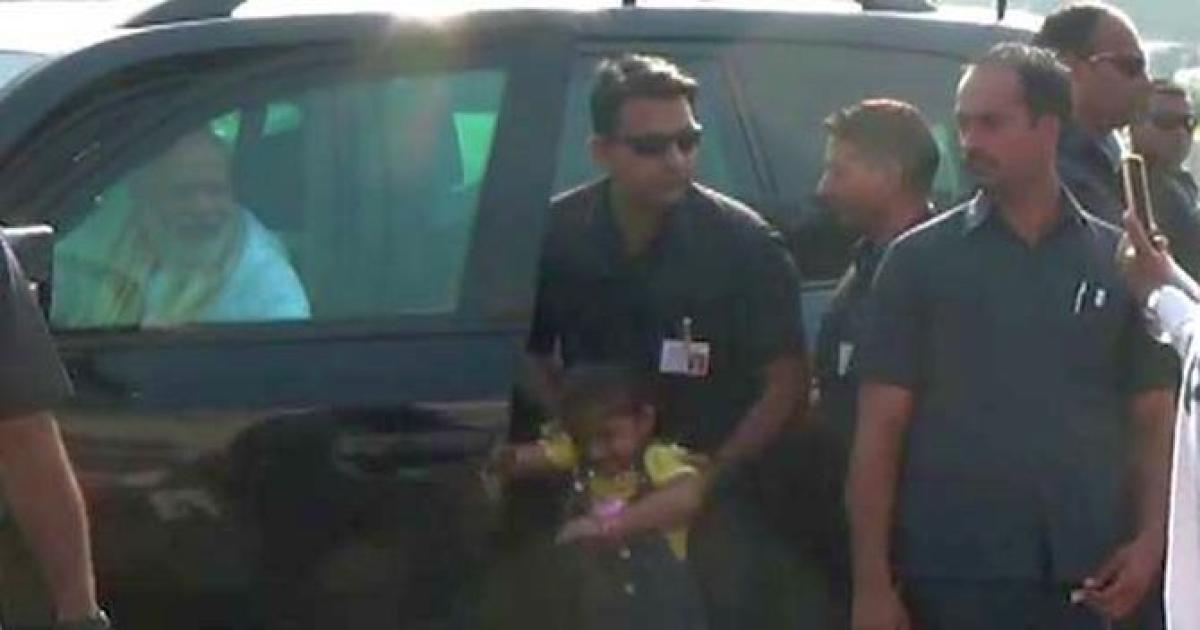 Seeing the little girl rushing towards the car, SPG commandos accompanying the Prime Minister tried to stop her. But to the surprise of everyone, Modi promptly have his convoy stopped and asked the commandos to allow her to come to him.