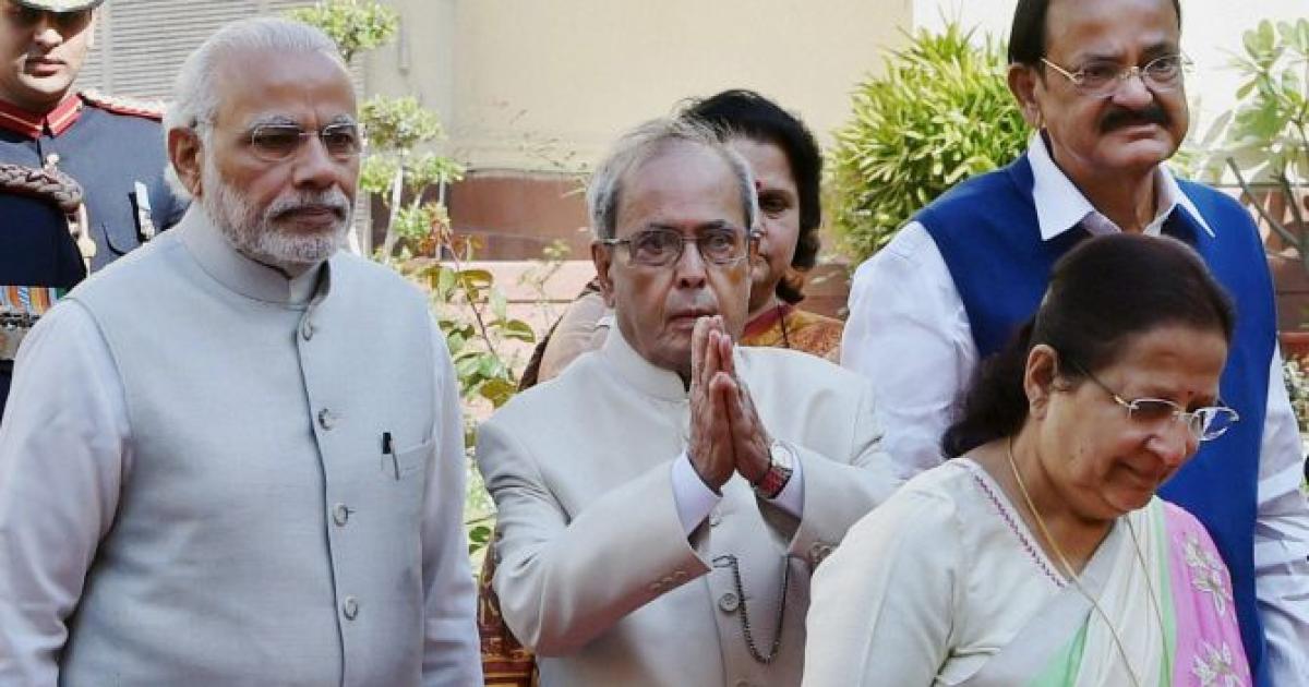 Prime Minister Narendra Modi, President Pranab Mukherjee, Lok Sabha Speaker Sumitra Mahajan, Parliamentary Affairs Minister M Venkaiah Naidu walk towards the Central Hall at Parliament House for his address on the first day of Budget Session. Photograph: Shahbaz Khan/PTI
