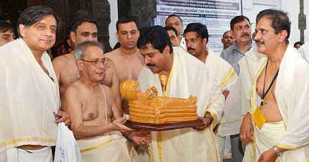 Image: President Pranab Mukherjee visits the Shree Padmanabhaswamy temple in Thiruvananthapuram on Saturday. MP Shashi Tharoor is also seen.