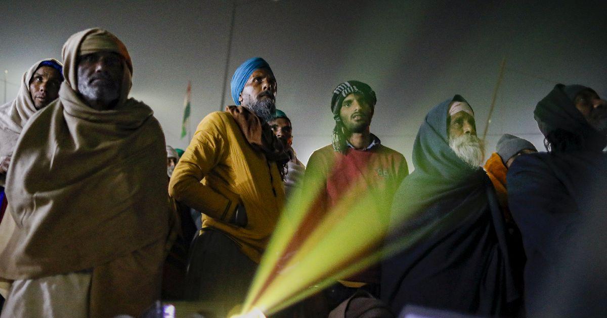 IMAGE: Farmers watch a movie projected on a screen at their agitation site at Ghazipur border, in New Delhi, on Thursday. Photograph: Ravi Choudhary/PTI Photo