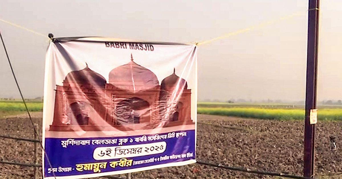 IMAGE: A poster of the Babri Masjid is seen displayed at the site where the mosque’s foundation stone was laid in Murshidabad. Photograph: ANI video grab
