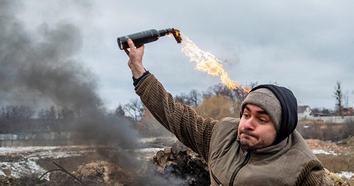 Civilians in Zhytomyr, Ukraine, March 1, 2022, train to throw Molotov cocktails to defend the city, as Russia's invasion of Ukraine continues.