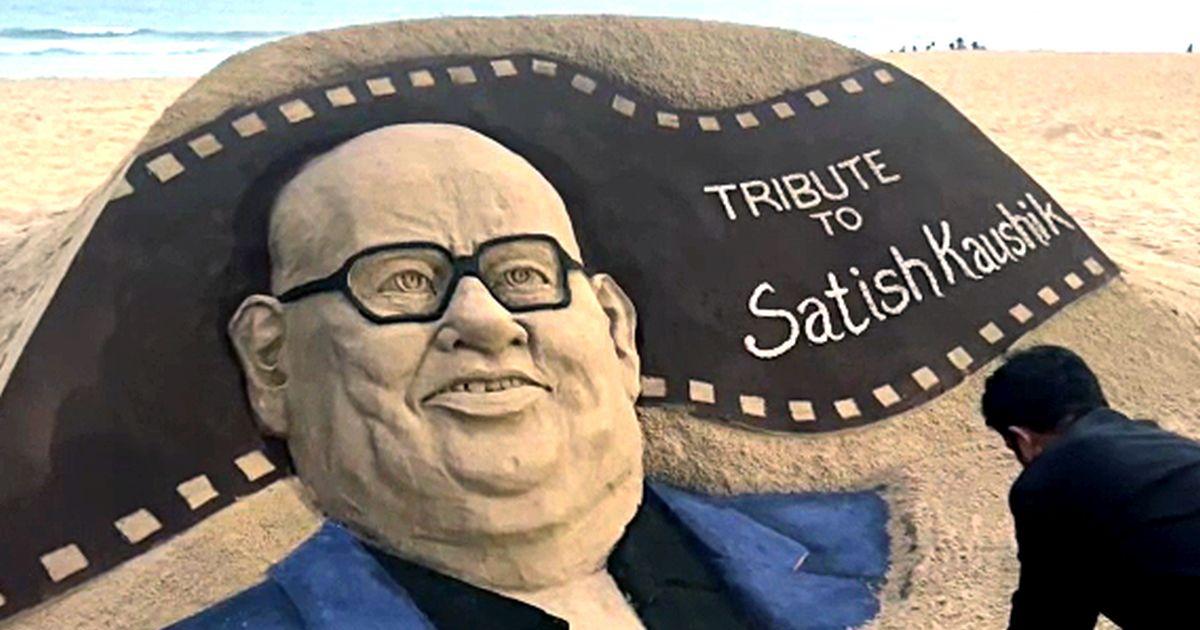 IMAGE: Sand artist Sudarsan Pattnaik creates a sand art of Bollywood actor-director Satish Chandra Kaushik as a tribute to him, in Puri on Thursday. Photograph: ANI Photo