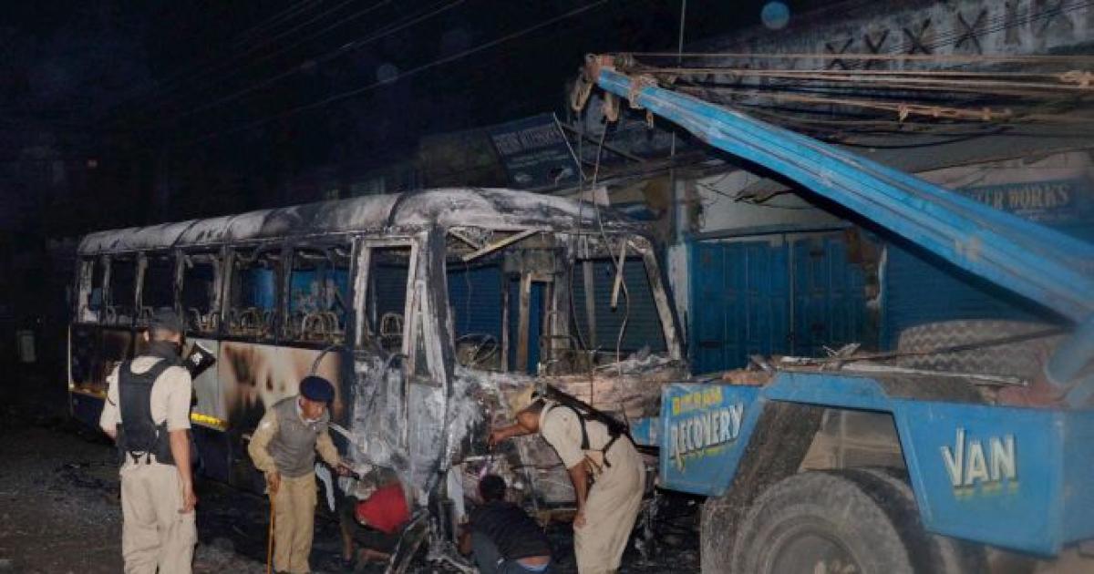 Image: Security personnel near a vehicle which was torched by a mob during a mass protest where they pulled out a rape accused from a district jail and lynched him in Dimapur on Thursday night. Photograph: PTI Photo