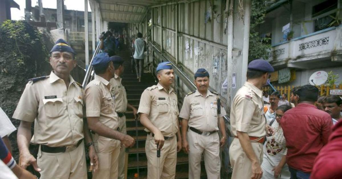 Image: Policemen stand outside Elphinstone railway station's foot over bridge in Mumbai on Friday. Photograph: PTI Photo