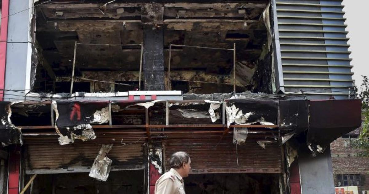 A policeman walks past a burnt shop in Trilokpuri, New Delhi on Sunday, two days after a clash between two groups. Kamal Kishore/PTI Photo