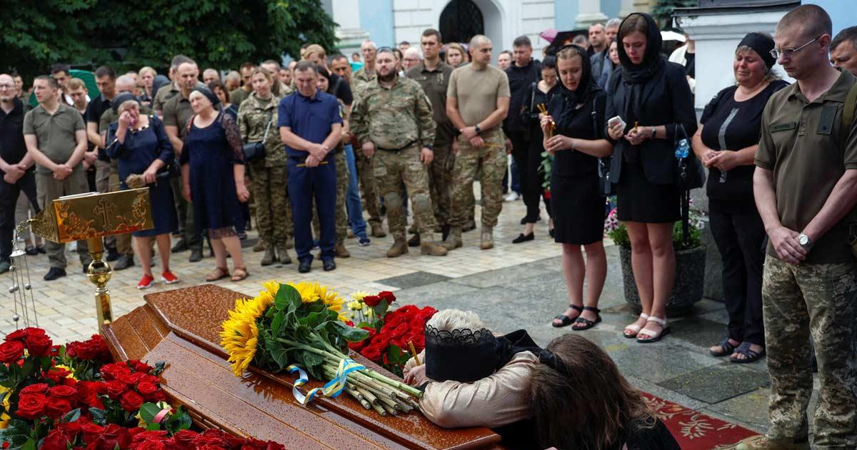 IMAGE: The mother and wife of Major Andrii Verkhohliad, a Ukrainian officer killed in battle against Russian troops, weep by his coffin at his funeral in Kyiv. Photograph: Valentyn Ogirenko/Reuters